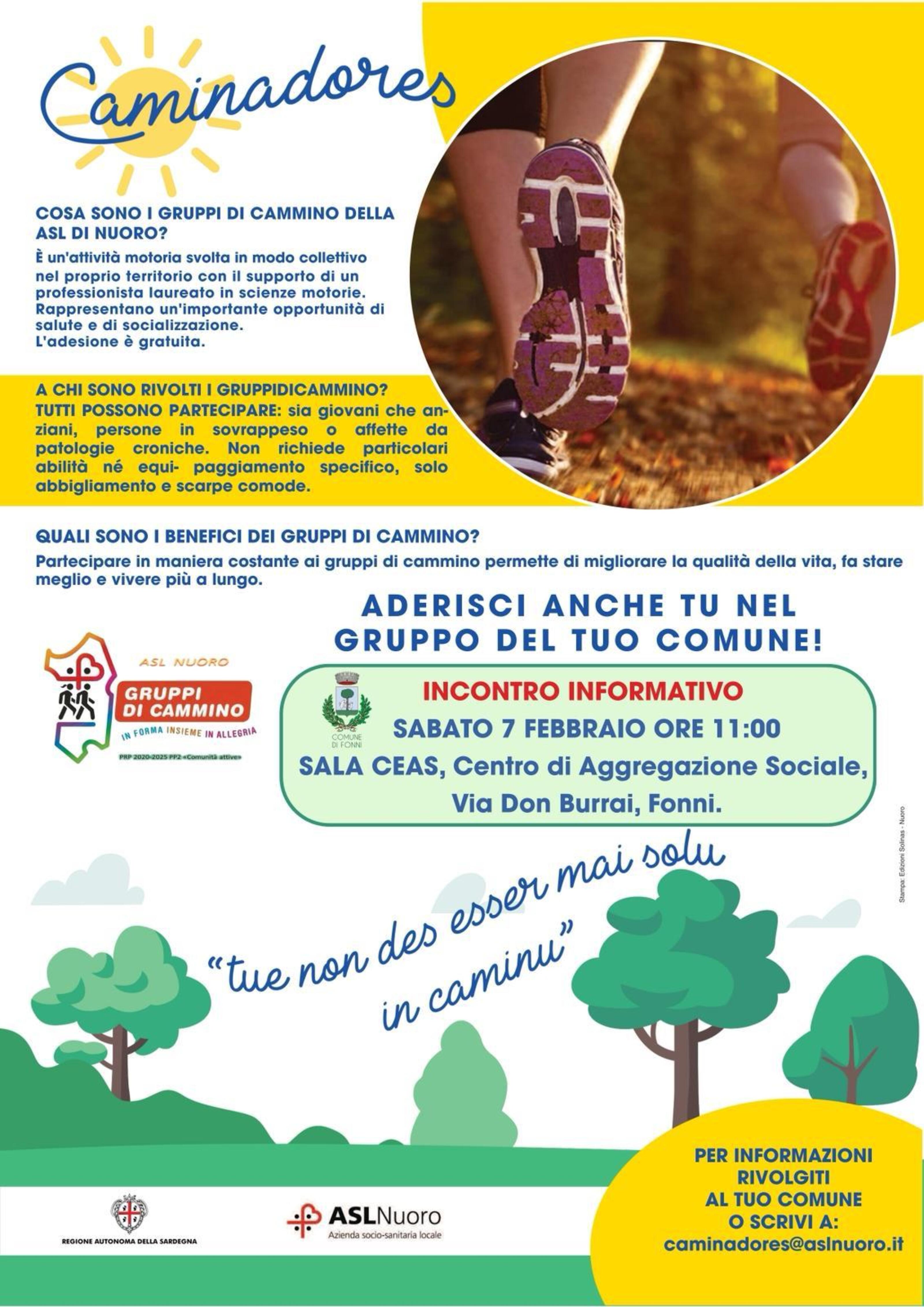 Sabato 7 febbraio 2026 ore 11:00 nella Sala CEAS in via Don Burrai a Fonni si terrà un incontro informativo per il progetto "Caminadores- Gruppi di Cammino"